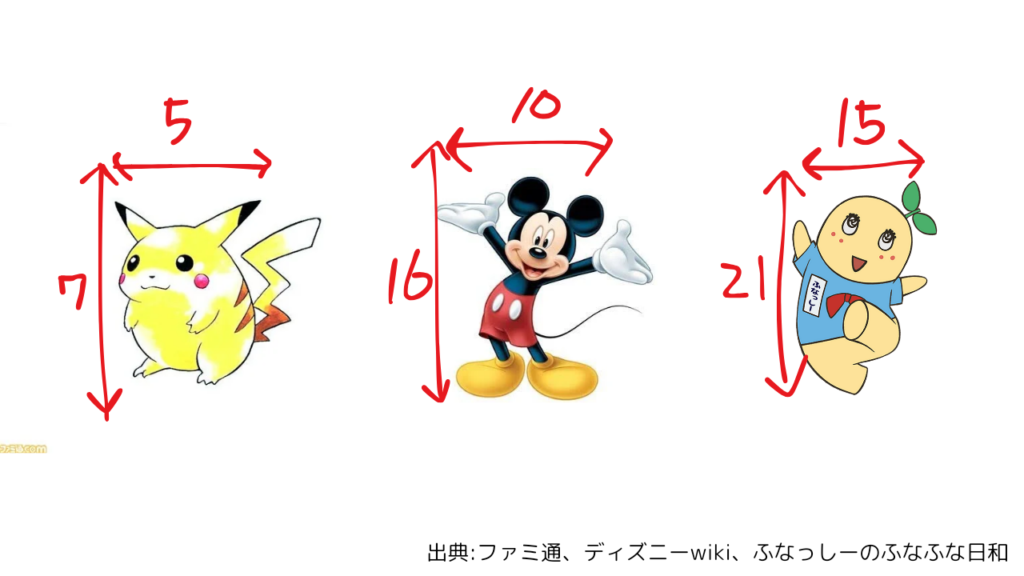 ちなみに適当な数ではなく、ピカチュウとふなっしーは白銀比、ミッキーは黄金比と呼ばれる比。