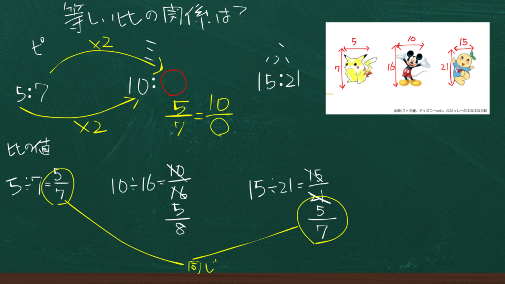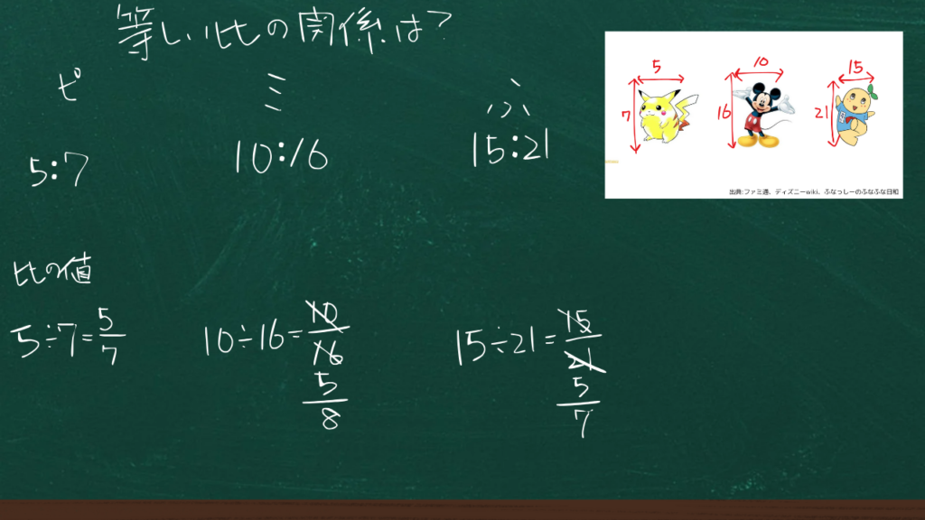 ピカチュウとふなっしーが5/7、ミッキーが5/8なので、等しい比のキャラクターはピカチュウとふなっしー。