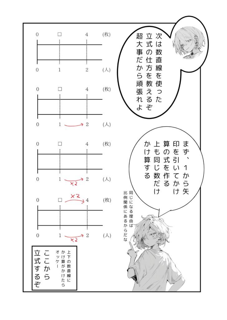 さあ、そのへんの裏紙に数直線をかいて式を立ててみてください。