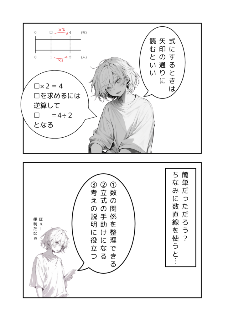 教師が「数直線使うと式が迷わずに立てられるね!」なんて言わなくても、一目瞭然。