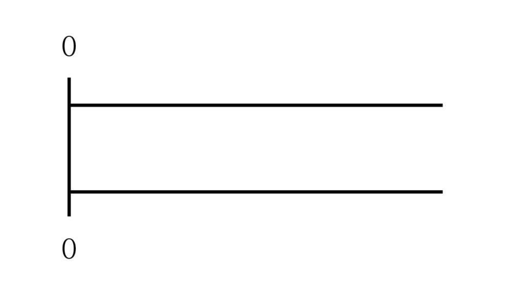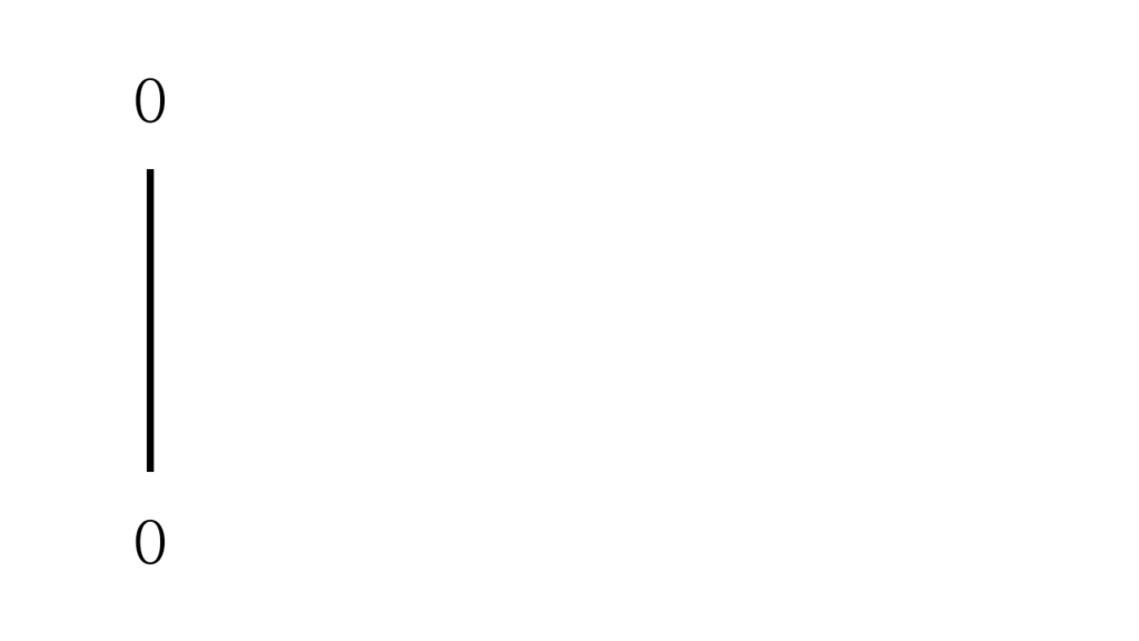 まず、たての直線を書いて、上下に0をかきます。
