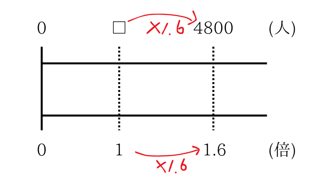「A町の人口は4800人でB町の1.6倍です。B町の人口は何人ですか。」(5年小数倍の問題)