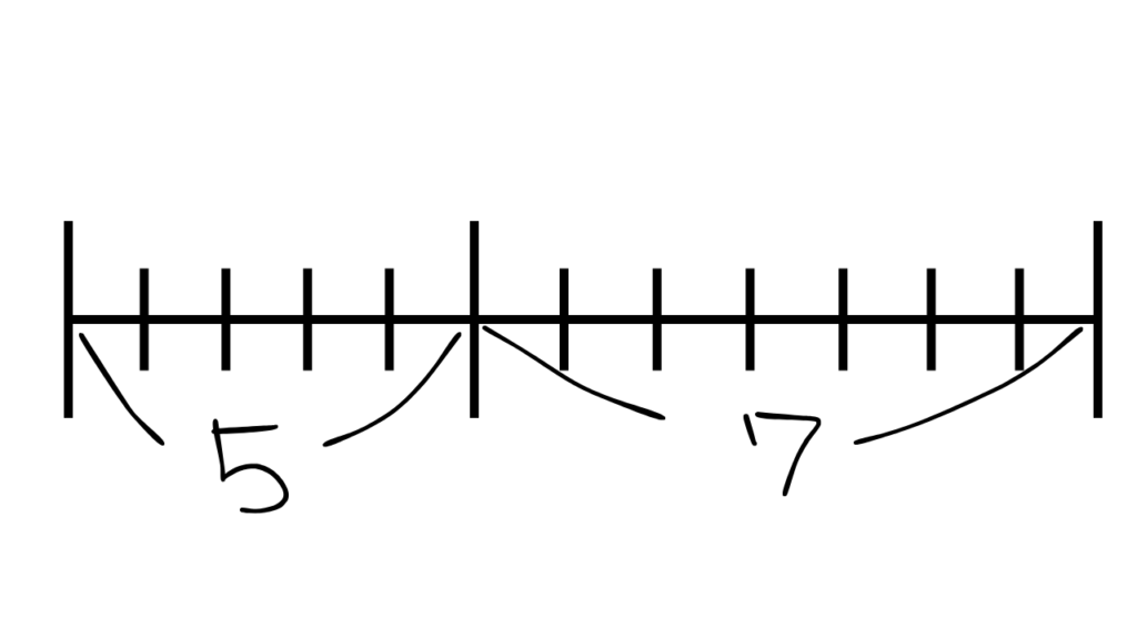 T「比の文章題では線分図を使います。まず12マス分線を引いて。」