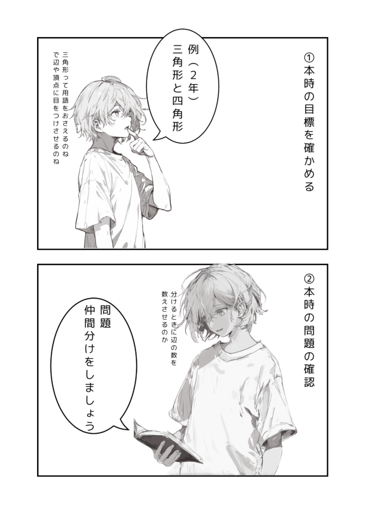 →子どもの考えを比較して、より簡潔に表したりより良い表現を考えさせたりする