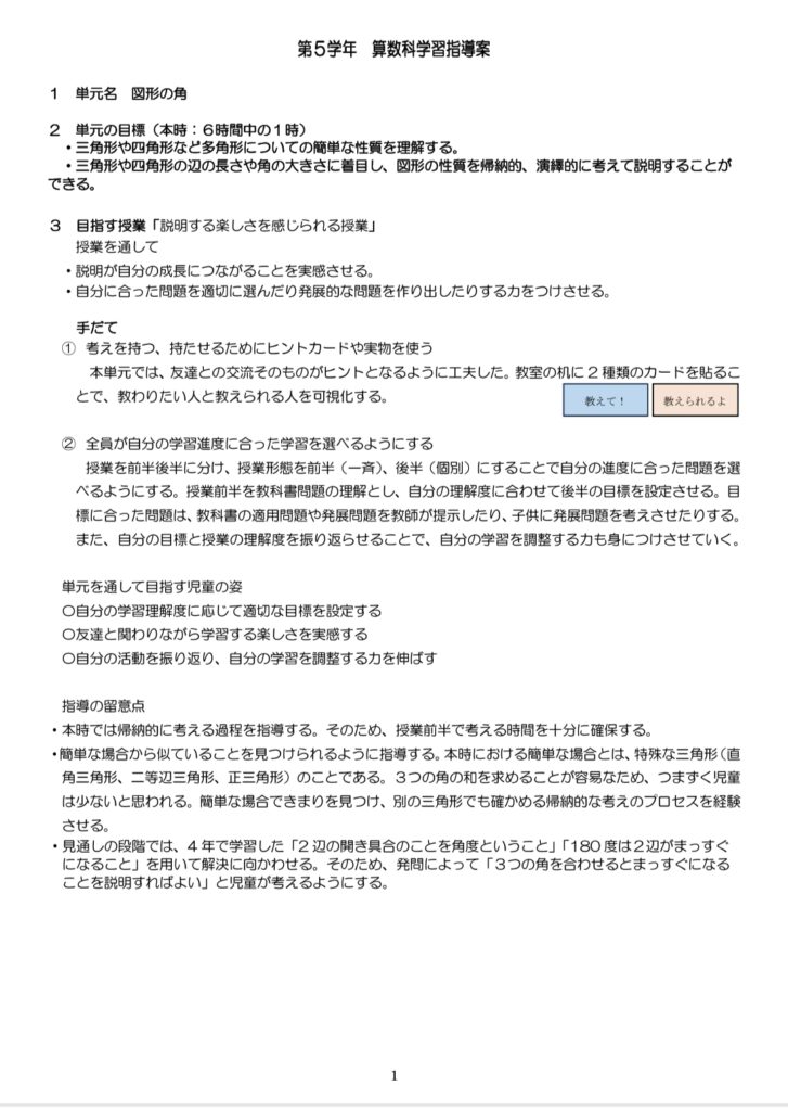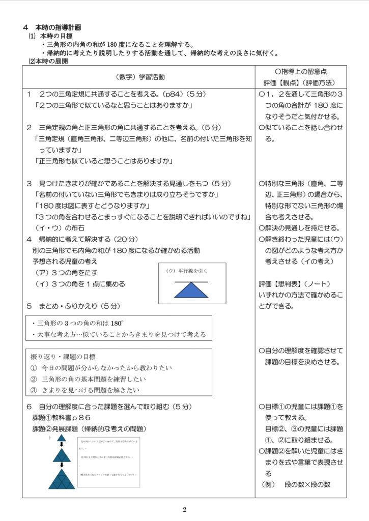 5年の指導案は、前半の一斉指導を長く取っている。三角形の内角の和を求める考え方(帰納的な考え)をしっかり教えたいのが理由だ。