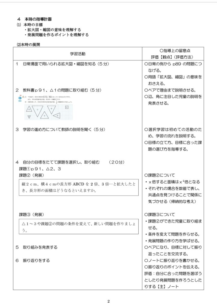 6年の指導案は学力中〜上位のコースを想定しているので課題選択の時間を増やしている。基本の問題に取り組みたい、発展問題がいいなど子供のニーズが多岐にわたるコースだからだ。