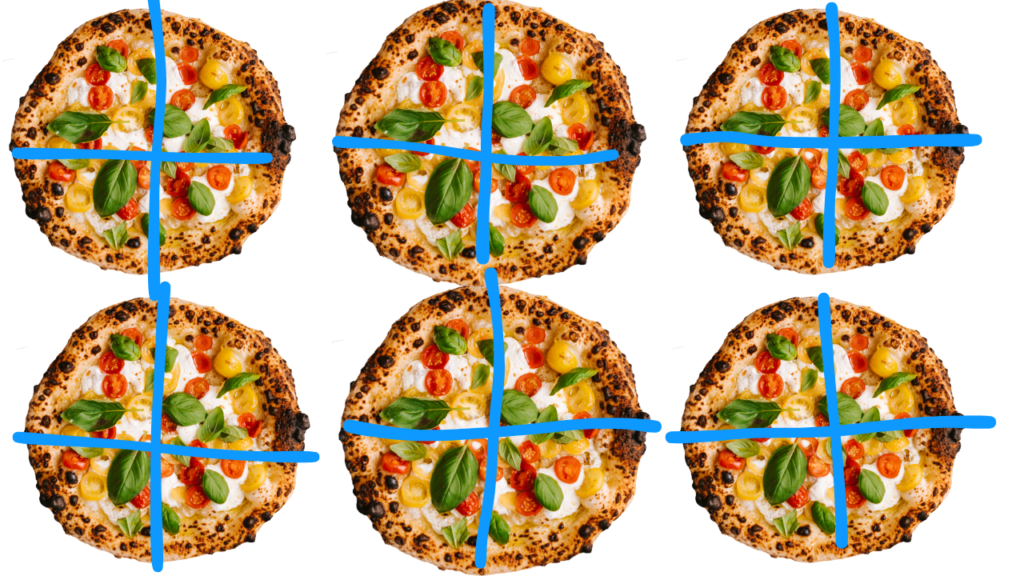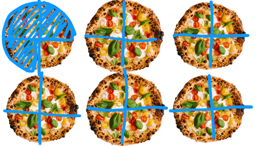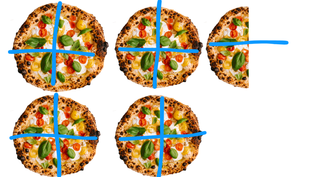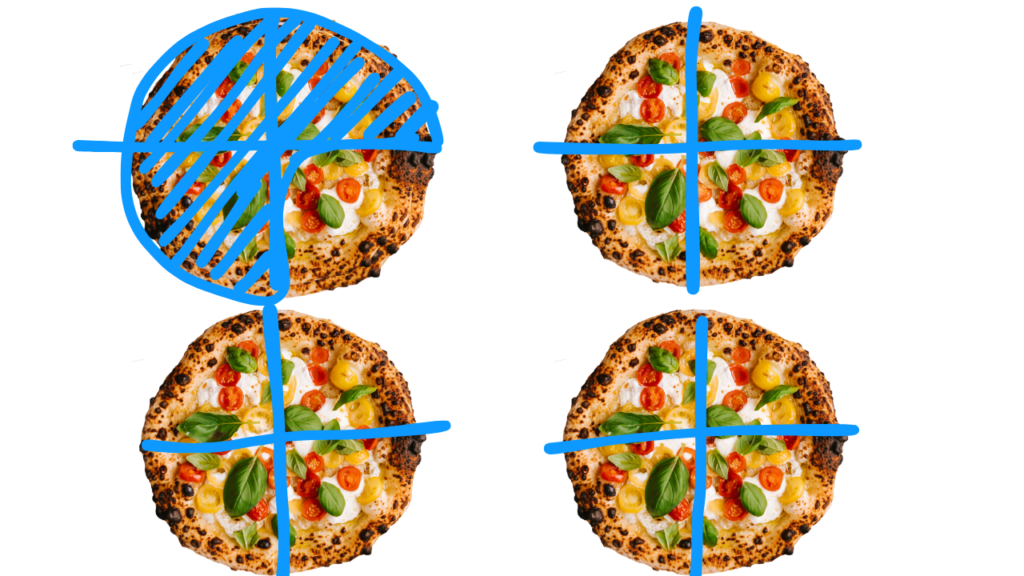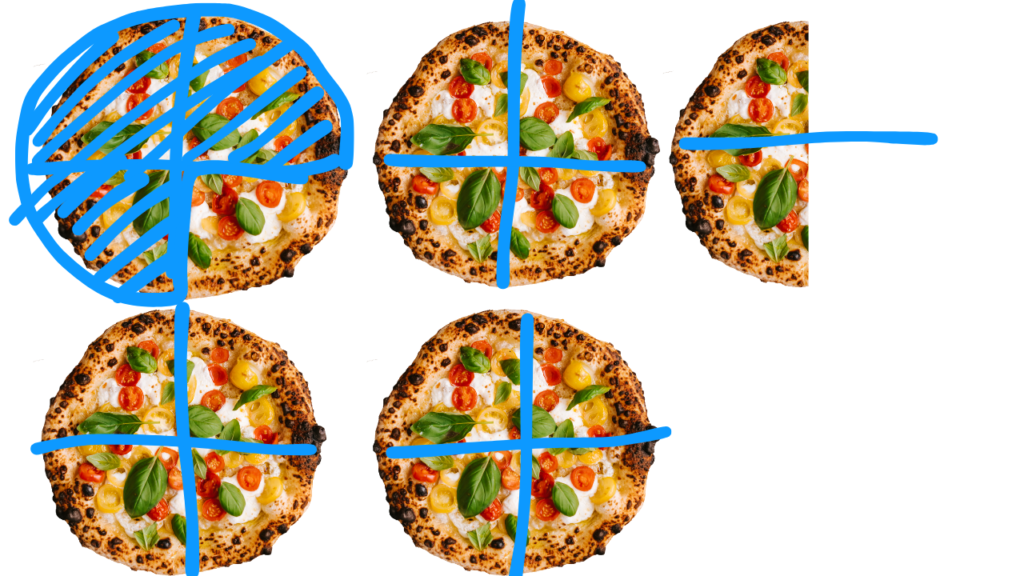3/4というのは、4つに分けたうちの3枚を配るという意味だから、まず1枚のピザを4等分する。