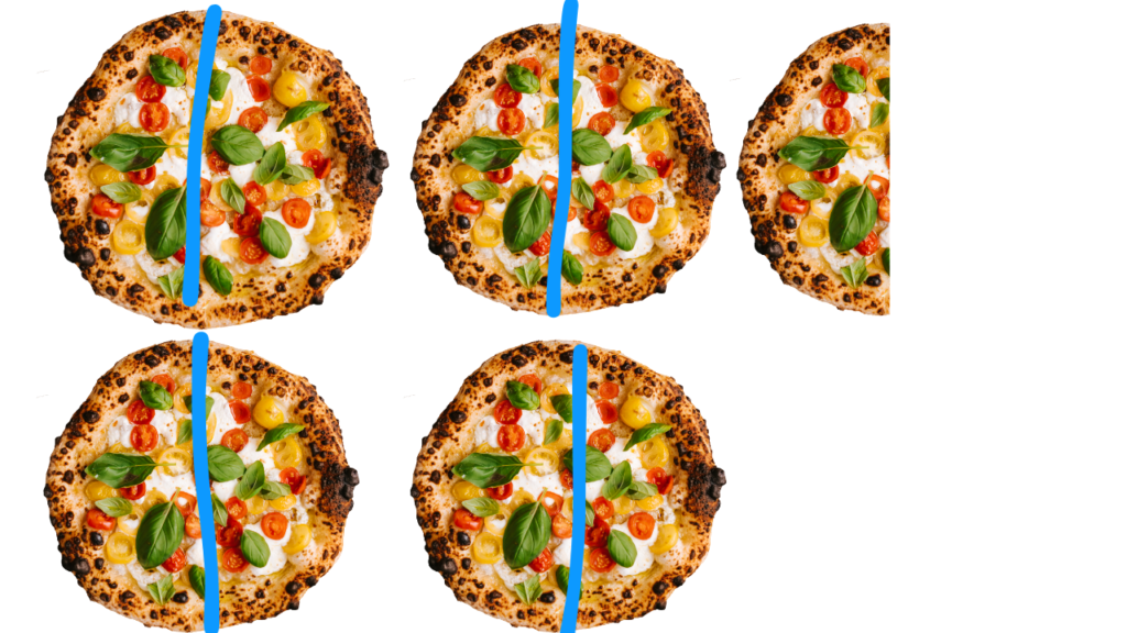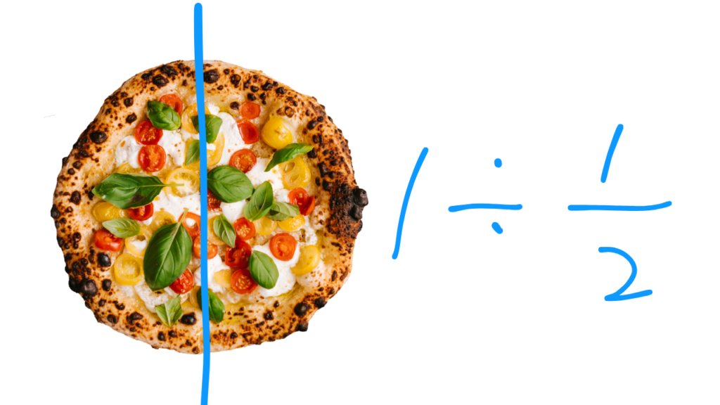 (4枚のピザを1/2ずつ配ると8人に分けられるってこと)